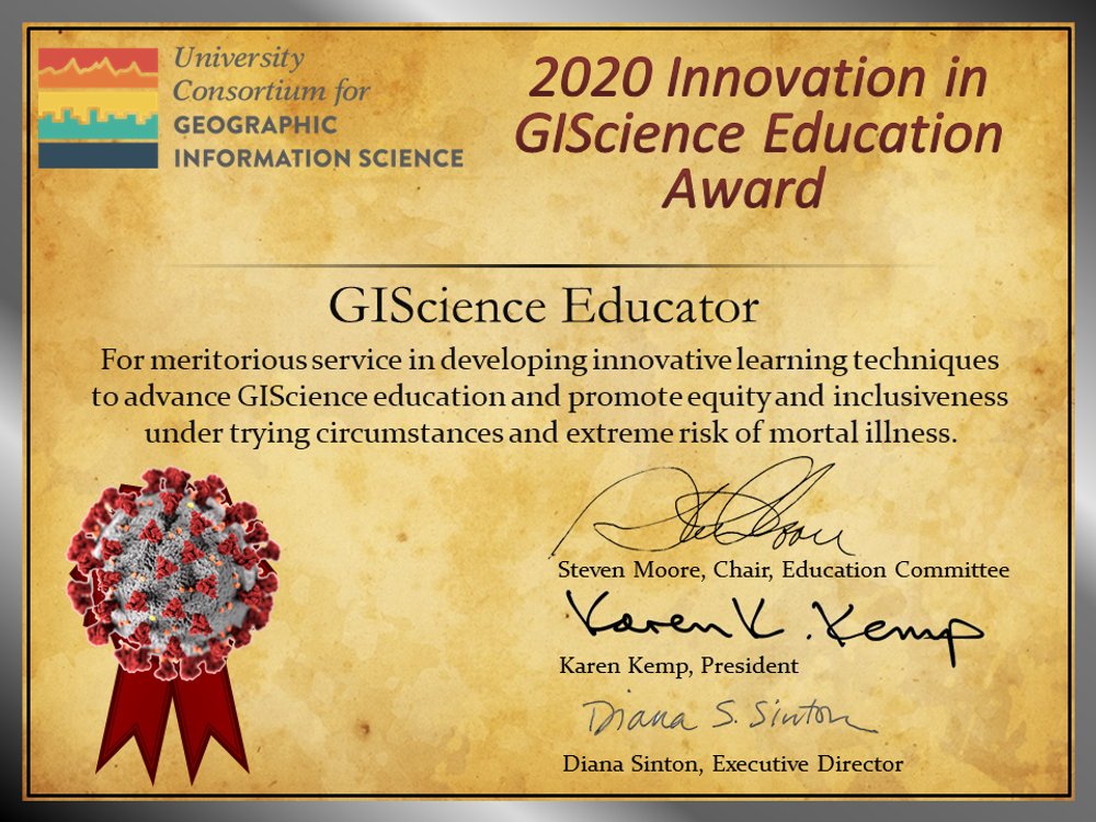 The UCGIS Innovation in GIScience Education Award was first offered in 2020, and will continue to be offered in even-numbered years. The award was designed for individuals who have contributed outstanding innovations to GIScience education. The award is intended to recognize innovative contributions of both national and international significance to GIScience education. GIS education innovations may include, but are not limited to: